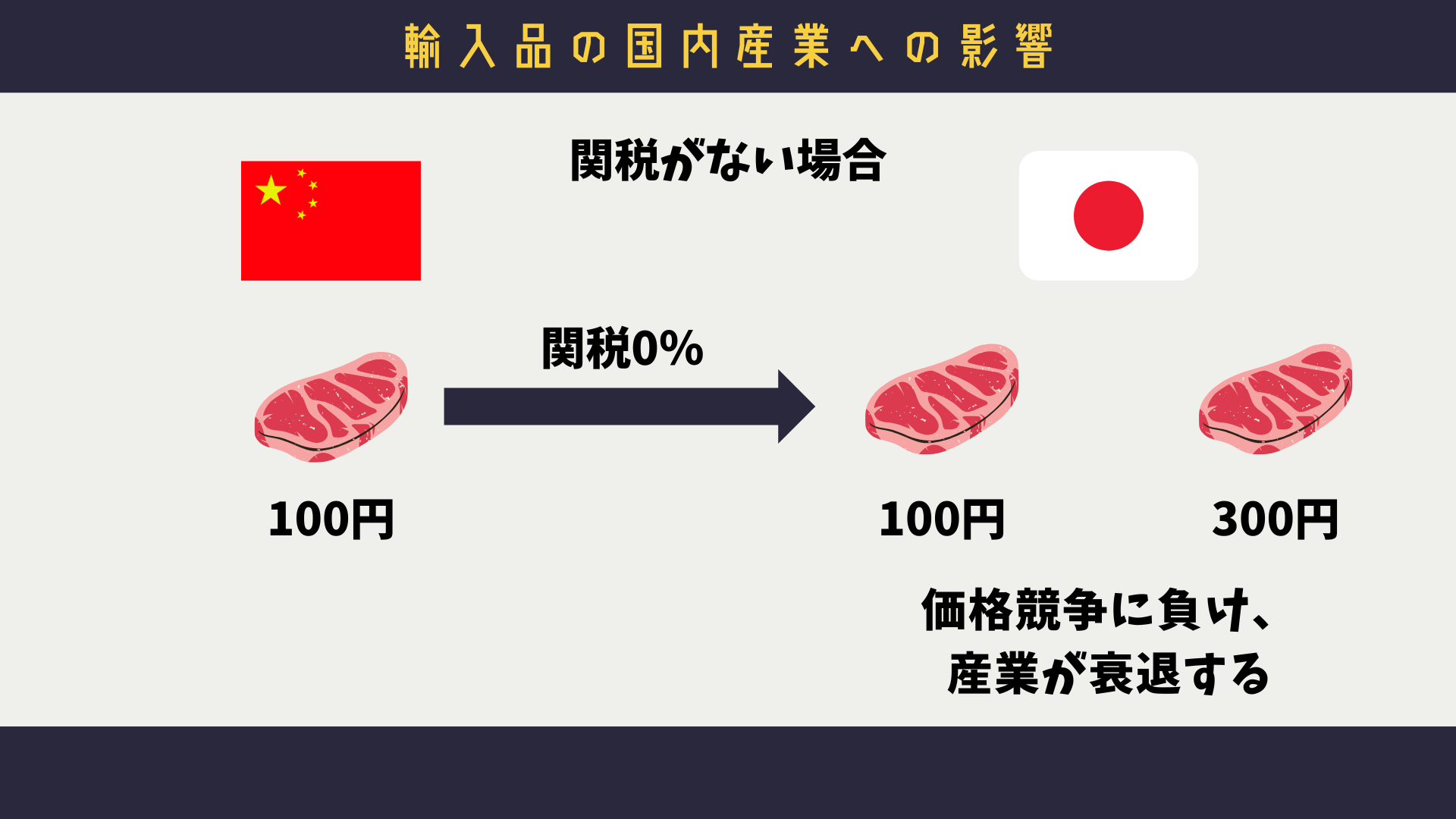 この現象を防ぐため、産業が国際的な競争力を持たない分野に対しては輸入品に対して関税をかけることで衰退を抑制します。