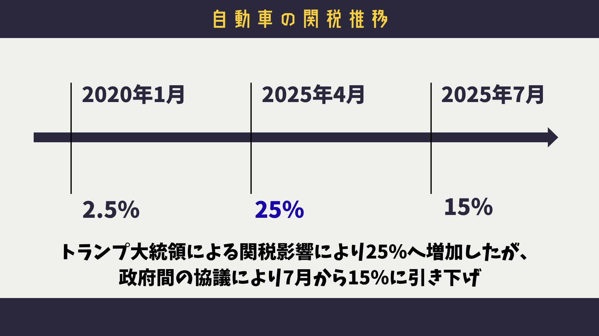 7月には間税引き下げ交渉によって15%となっています。(8月現在)